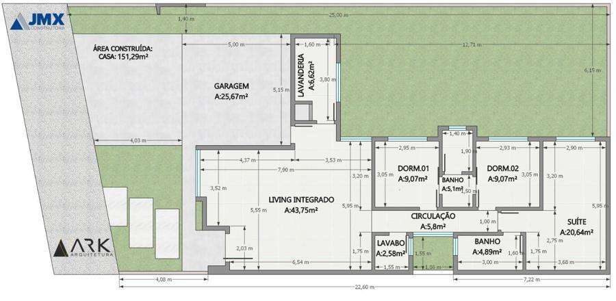 Área Total do Terreno 300,00m² : 12,00m de largura X 25,00m de comprimento.