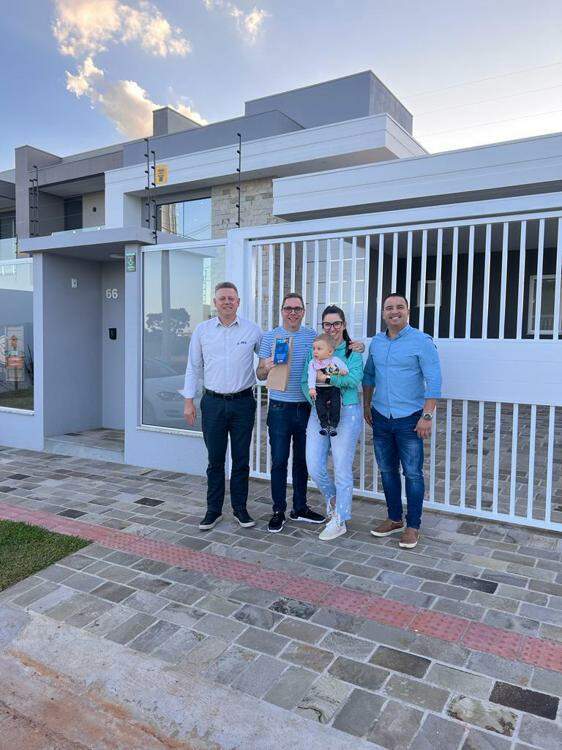 A residência conta com acabamento de piso porcelanato classe A e piso laminado nos dormitórios, rodapés de poliestireno, esquadrias externas em alumínio, com persiana integradas nas janelas dos dormitórios, pele de vidro, vaga coberta para dois carros, portas internas laqueadas, rebaixamento em gesso, esperas para ar condicionado, cabeamento de tv e internet, água quente e fria, calçadas em pedra basalto, paisagismo no jardim, muros de divisa em alvenaria e muros de frente em vidro, com portão eletrônico de acesso de veículos e portão de acesso de pedestres.